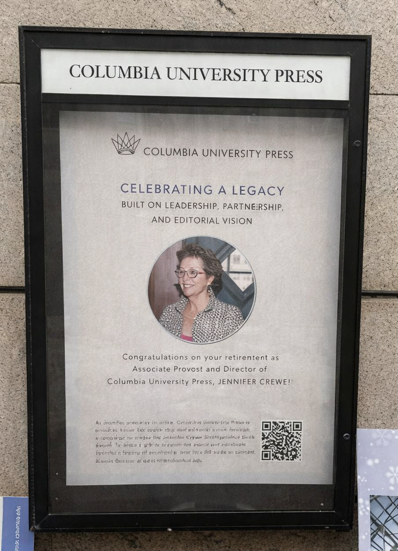 Jennifer, thank you for taking the time to speak with us and for your outstanding leadership. In your forty years at Columbia University Press, you have been a trailblazer in scholarly and university press publishing and also an inspirational leader who strengthened the Press’s role within the university and the broader publishing community while fostering a culture of equity and inclusion. You have left a lasting impression on the Press and the community it serves—one that will continue to inspire future generations. Those who wish to honor your legacy may consider making a gift to support the Jennifer Crewe Distinguished Book Award. We thank you for your extraordinary service and wish you the very best in the next chapter of your life.