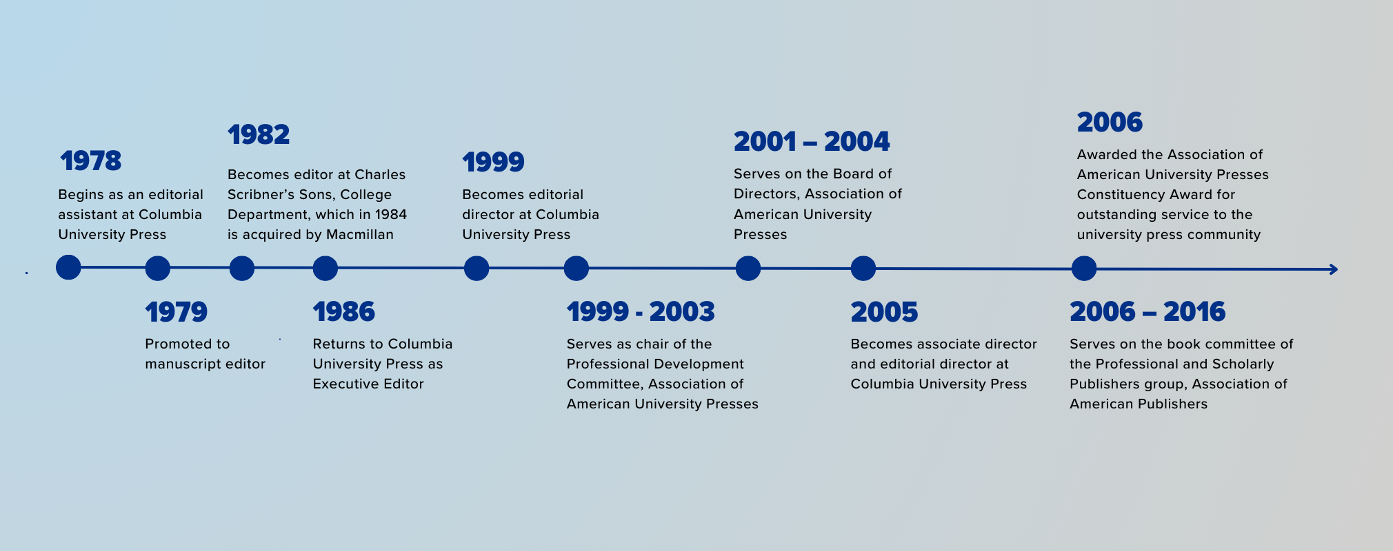Throughout her four decades in publishing, Crewe not only helped shape the industry but also guided the Press with a strategic direction that strengthened ties with Columbia University, while working to create more equitable pathways for women in publishing. In addition to her leadership at Columbia University Press, her service work across the industry and in professional associations contributed to changes that continue to this day.
